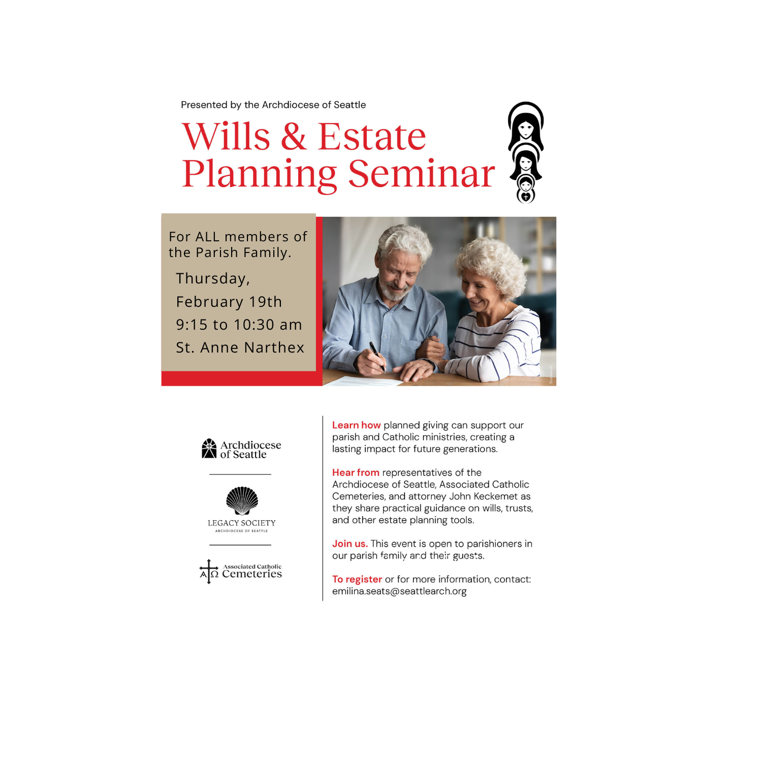 General Info: parishoffice@sacredheartseattle.org or info@stanneseattle.org
